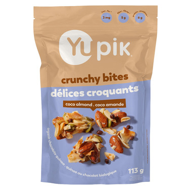 Yupik Crunchy Bites are coconut clusters with almonds, pumpkin seeds & chocolate covered quinoa puffs. Glazed with pure maple syrup, these bites are ideal for snacking or as a topping on sweet creations.
