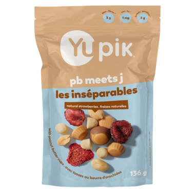 Yupik PB Meets J is a delicious combination of dried strawberries, peanut butter cups and shortbread cookies. Prepared in-house, this soft and crunchy blend is a celebration of a nostalgic peanut butter and jelly sandwich. Enjoy it as a snack or as an addition to sweet creations.
