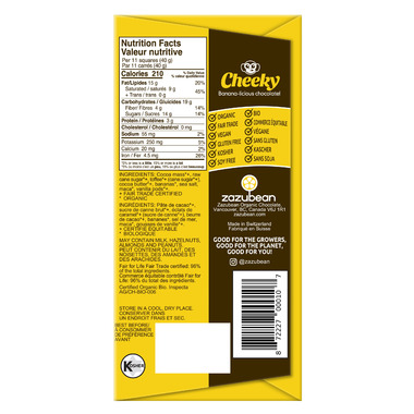 Cocoa mass**, Cane sugar**, Toffee**, (Cane sugar**, Whole milk powder*), Cocoa butter**, Bananas*, sea salt, Maca*, Vanilla**. **Fair Trade Certified AND Certified Organic. *Certified Organic. Contains milk. May contain traces of nuts and peanuts.