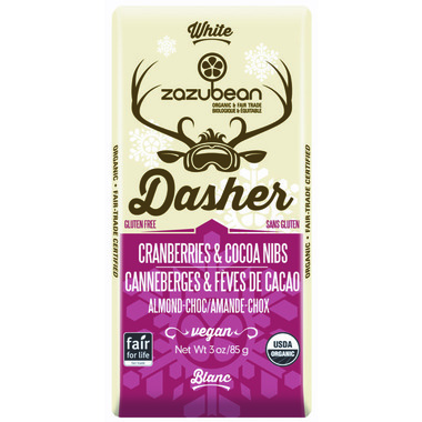 This soy free white chocolate is made with cocoa nibs and cranberries.