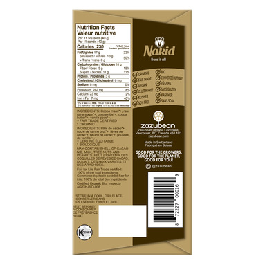 zazubean Nakid Cocoa Nibs & Vanilla 73% Dark Chocolate is certified organic.