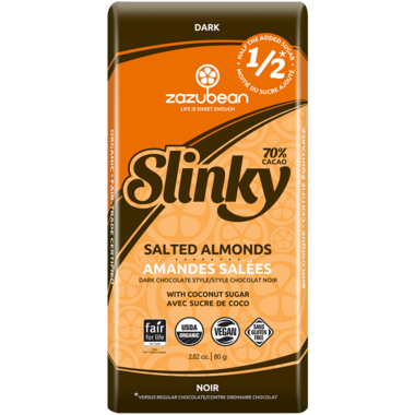This delicious 70% dark chocolatey bar with salted almonds is irresistible with half the added sugar. Life is sweet enough! Made with coconut sugar.
