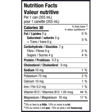 FILTERED WATER, ORGANIC CHERRY JUICE FROM CONCENTRATE (WATER, ORGANIC CHERRY JUICE CONCENTRATE), ORGANIC RAW CANE SUGAR, NATURAL FLAVOURS, ORGANIC HOPS EXTRACT, VITAMIN AND MINERAL BLEND (MAGNESIUM CITRATE, CYANOCOBALAMIN (VITAMIN B12)), ORGANIC SCHISANDRA EXTRACT, ORGANIC ECHINACEA EXTRACT, POTASSIUM CITRATE, CITRIC ACID, ORGANIC LICORICE ROOT EXTRACT, ORGANIC CACAO EXTRACT, ORGANIC STEVIA. Dairy, Egg, Mustard, Peanuts, Seafood, Sesame, Soy, Sulfites, Tree Nuts, Wheat Gluten