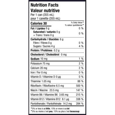 Filtered water, Organic cherry juice concentrate, Organic raw cane sugar, Organic raspberry juice concentrate, Organic red beet extract, Citric acid, Organic hops extract, Organic echinacea extract, Green tea extract, Vitamin blend [thiamine HCL (vitamin B1), riboflavin (vitamin B2), niacin, pantothenic acid, pyridoxine hydrochloride (vitamin B6), cyanocobalamin (vitamin B12)], Potassium citrate, Organic licorice root extract, Organic stevia, Organic cacao extract, Natural flavour. Dairy, Egg, Mustard, Peanuts, Seafood, Sesame, Soy, Sulfites, Tree Nuts, Wheat Gluten
