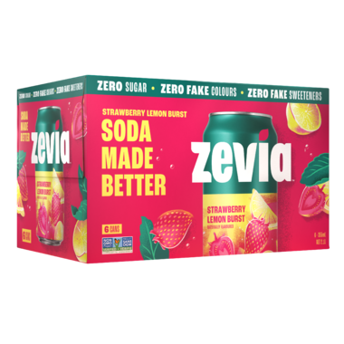 Zevia Soda Made Better. Strawberry Lemon Bust. Zero Sugar, Zero Fake Colours, Zero Fake Sweeteners.
