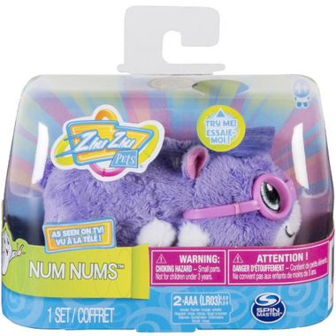 Zhu Zhu Pets Hamster Num Nums is the heart of the Zhu Zhu gang. The heart-shaped birthmark on her purple fur is a small symbol for the big heart inside this sweet Hamster. Num Nums is Pipsqueak's right hand (or right paw) Hamster. She's always ready to help out her best friend Pipsqueak. Hear this interactive hamster make adorable noises by pressing the button at the back of her neck. Is Pipsqueak in trouble? Press the button on her lower back and Num Nums will spring into action, whizzing, whooshing and spinning around your home. The sensor in her nose helps Num Nums safely navigate any space.
