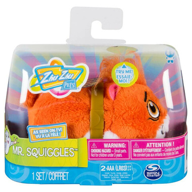What's Mr. Squiggles inventing now? Find out for yourself when you take home Zhu Zhu Pets Hamster Mr. Squiggles. With a brain that won't stop working, this Hamster's mind is always spinning. That's why you'll find a spiral birthmark on his bright orange fur. Interactive Mr. Squiggles can't wait to tell you about his latest invention. Press the button on the back of his neck and he'll make adorable hamster noises. With a bunch of new and exciting ideas bouncing around his hamster head, Mr. Squiggles can be a little scatter-brained. Press the button on his lower back and he'll whiz around, searching for things he's misplaced. Fortunately for Mr. Squiggles, the sensor inside his nose helps him navigate spaces. He may be scatter-brained, but not clumsy! Bounce ideas around and have hours of fun with Zhu Zhu Pets Hamster Mr. Squiggles.