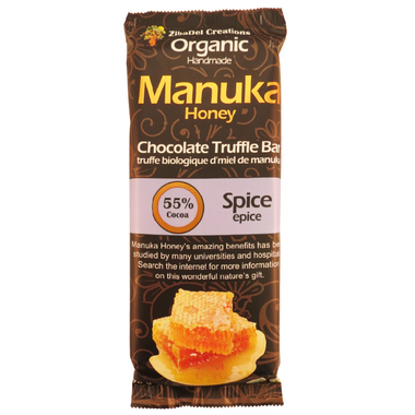 A melt-in-your-mouth honey ganache coated with smooth chocolate, with a natural kick. Hand crafted with Raw Organic Active Manuka Honey from New Zealand. Manuka honey's amazing benefits have been researched by many hospitals and universities. This bar uses This bar uses raw manuka honey to give you a pleasing experience every bite.