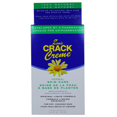 Zim's Crack Creme Original Liquid Formula is an All-Natural liquid herbal formula that softens and moisturizes dry, cracked skin. Developed by a pharmacist. Recommended for nighttime use. Use on Hands, Feet, Elbows, Cuticles & More.