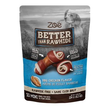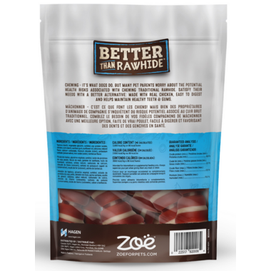 Chewing, It's what dogs do. But many pet parents worry about the potential health risks associated with chewing traditional rawhide. Satisfy their needs with a better alternative: Zoe Better than Rawhide. Made with real chicken, easy to digest and helps maintain healthy gums and teeth, Better than rawhide bones put your worries at ease while satisfying your dog's natural chewing instinct.