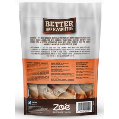 Chewing, It's what dogs do. But many pet parents worry about the potential health risks associated with chewing traditional rawhide. Satisfy their needs with a better alternative: Zoe Better than Rawhide. Made with real chicken, easy to digest and helps maintain healthy gums and teeth, Better than rawhide bones put your worries at ease while satisfying your dog's natural chewing instinct.