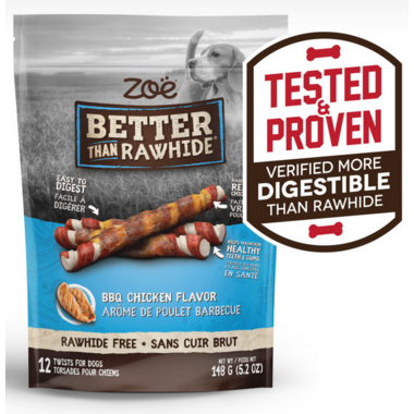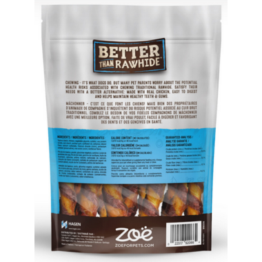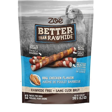 Chewing, It's what dogs do. But many pet parents worry about the potential health risks associated with chewing traditional rawhide. Satisfy their needs with a better alternative: Zoe Better than Rawhide. Made with real chicken, easy to digest and helps maintain healthy gums and teeth, Better than rawhide bones put your worries at ease while satisfying your dog's natural chewing instinct.