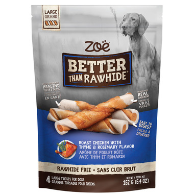 Satisfy your dogs natural instinct to chew with a better alternative to rawhide: Zoe Better Than Rawhide Roast Chicken With Thyme & Rosemary dog bones. These rawhide free dog bones are wrapped in real chicken. In fact, they've been tested and proven to be more easily digestible than rawhide. Whats more? These soft and chewy treats help maintain healthy teeth and gums. Now in a larger size for medium and large breed dogs. More bone for more chewing!