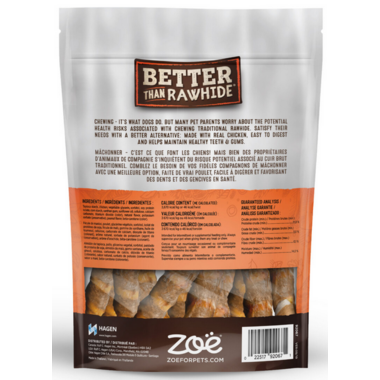 Chewing, It's what dogs do. But many pet parents worry about the potential health risks associated with chewing traditional rawhide. Satisfy their needs with a better alternative: Zoe Better than Rawhide. Made with real chicken, easy to digest and helps maintain healthy gums and teeth, Better than rawhide bones put your worries at ease while satisfying your dog's natural chewing instinct.