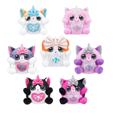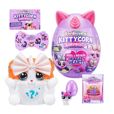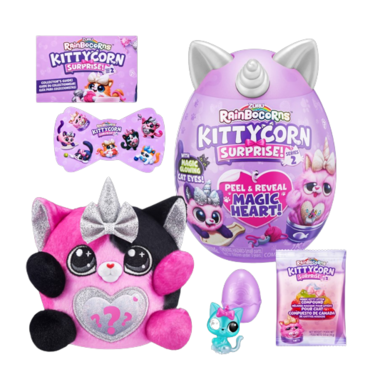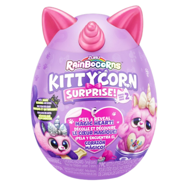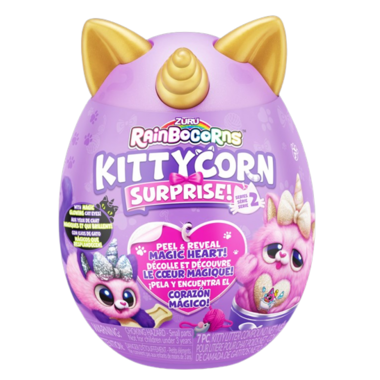 Rainbocorns Kittycorn Surprise are destined to be your new paw-fect pal! These kitties come with eyes that glow in the dark and a magic peel and reveal heart that tells you what your kittycorn loves! There are 10 surprises inside including gooey kitty litter compound and stickers! Adopt all 6 kittens, including the rare big bow kittycorn!