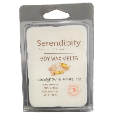 Serendipity's Eucalyptus & White Tea scented soy wax melts are a beautiful light and clean scent. It combines cooling eucalyptus with a soothing white tea scent and a touch of warm vanilla to bring it all together.